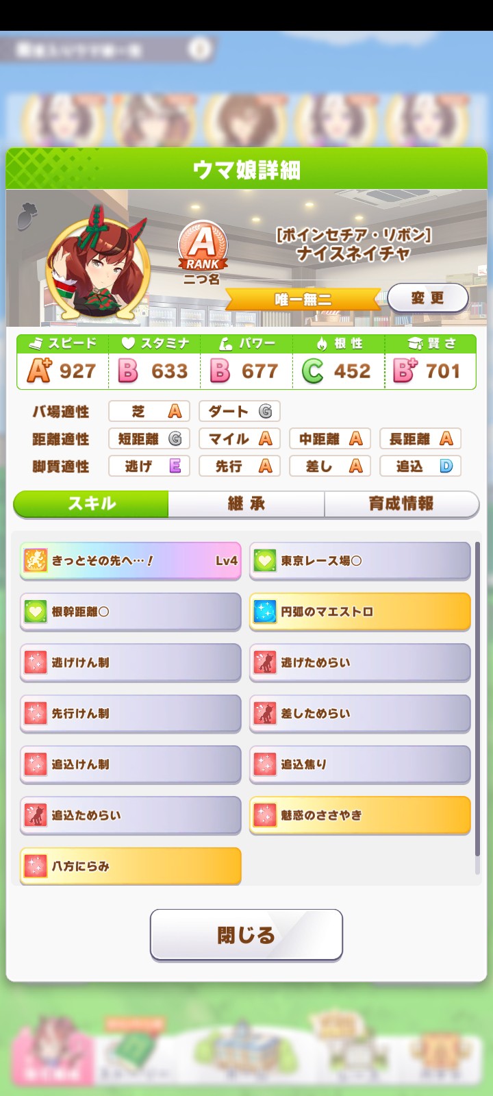 デバフネイチャは賢さと後はスキルをひたすら追いかけつつレースだしまくるだけやぞ